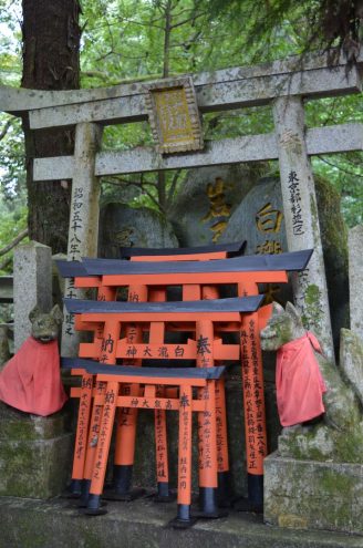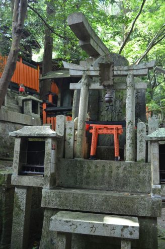 Vorbei an kleinen Bächen und Fuchsstatuen windet sich der Hauptweg nach oben. Füchse, so sagt man, seien die Boten des Gottes Inari, und so wundert es kaum, dass sie entlang des Weges in Form von Stein-oder Bronzestauen überall zu finden sind. Generell gelten sie als besonders hilfsbereit, können aber auch in Menschen hineinschlüpfen und Besitz von ihnen ergreifen, so dass man ihnen mit großem Respekt begegnet.