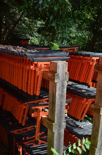 Immer höher winden sich die Tunnel aus roten Torii durch den grünen Wald, nur um an einigen Stellen aufzubrechen und den Augen eine farbige Abwechslung zu bieten. Der Schrein selbst ist dem Gott des Sake und der Reisernte, auch Inari genannt gewidmet, geht auf das 8. Jahrhundert n.Chr. zurück und befindet sich auf der Spitze des Hügels. Heute allerdings ist auch Inari etwas moderner geworden und steht eher für Erfolg und Wohlstand, weshalb er gerade bei Geschäftsleuten sehr beliebt ist. Um Neujahr herum zieht es viele Unternehmer hierher um für ein erfolgreiches Geschäftsjahr zu beten. Dies wiederum erklärt auch, weshalb viele der roten Torii von zum Beispiel großen Unternehmen gesponsert sind, welche sich mit ihren Namen auf den Toren verewigt haben. Da es sich um japanische Schriftzeichen handelt, nimmt es für uns nichts vom Zauber weg, denn wir können es sowieso nicht lesen.