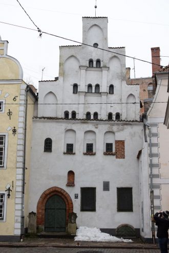 - Das älteste Wohnhaus in Riga ist von der Straße etwas zurück gebaut um Platz für Steinbänke zu schaffen. Diese Fläche war bei späteren Häusern kostbarer Wohnraum.