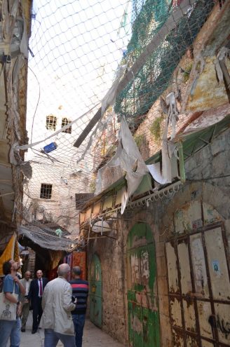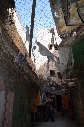 Mein Blick richtet sich nach oben, denn dort verläuft direkt über der Gasse ein Maschendrahtzaun. Auf ihm liegen Cola Dosen, Abfall, Eierschalen, Papier, einfach Müll. Der Maschendrahtzaun soll die Palästinenser vor den Attacken der jüdischen Siedler schützen, die den oberen Teil der Häuser bewohnen. Sie werfen immer wieder Müll, manchmal sogar Fäkalien auf die Auslagen in den arabischen Geschäften. Der Zaun hält einiges ab. Wir alle sind entsetzt und gehen schweigend weiter.