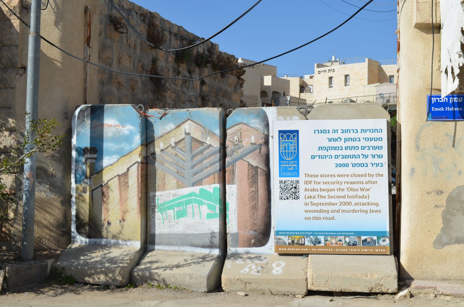 Die Straßen in Hebron hinter der Machpela sind leer, die Geschäfte geschlossen, die blauen Türen zugeschweißt, die Häuser unbewohnt. Es ist die Geisterstadt, die sich mitten durch Hebron zieht. Am Ende des Niemandslandes erstreckt sich ein Teil der jüdischen Siedlung Kirjat Arba. Sie gilt als der harte Kern der radikalen Siedlerbewegung. Unser Guide lässt uns laufen. Für ihn selber ist es verboten diesen Teil der Stadt zu betreten. Auf halben Wege ein Militärposten. Ein surreales Gefühl.