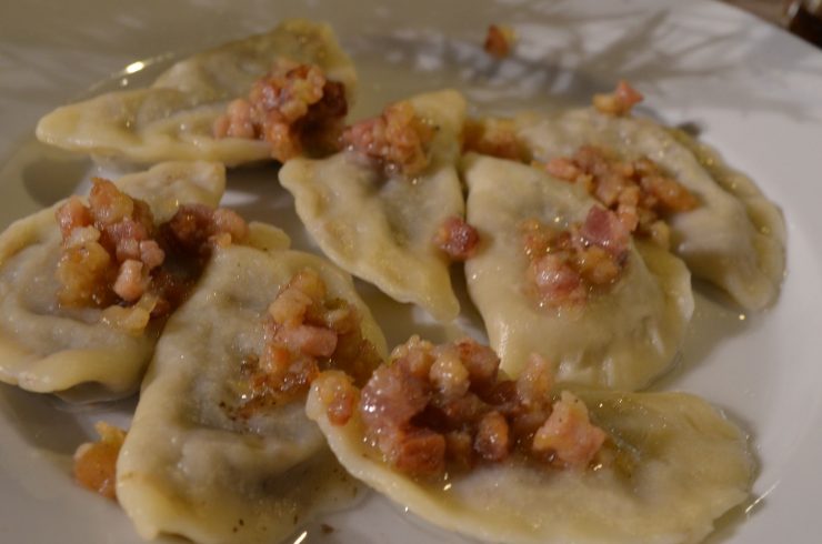 Ich habe mich für Euch auf die Suche nach den besten Pierogi Krakaus gemacht und bin nach mehreren Tagen Teigtaschen essen zum Ergebnis gekommen, dass es die besten Pierogi (und auch die wohl größte Auswahl) im jüdischen Viertel Kazimierz bei Pierozki u Vicenta gibt. Hier kann man zwischen 35 Sorten auswählen, süß und deftig, für jeden Geschmack ist etwas dabei, auch saisonale Füllungen werden angeboten. Pierogi gefüllt mit Blaubeeren, Apfel, Kirsche, Hüttenkäse mit Walnuss, Salami, Schinken, Spinat, Lammfleisch oder oder oder….