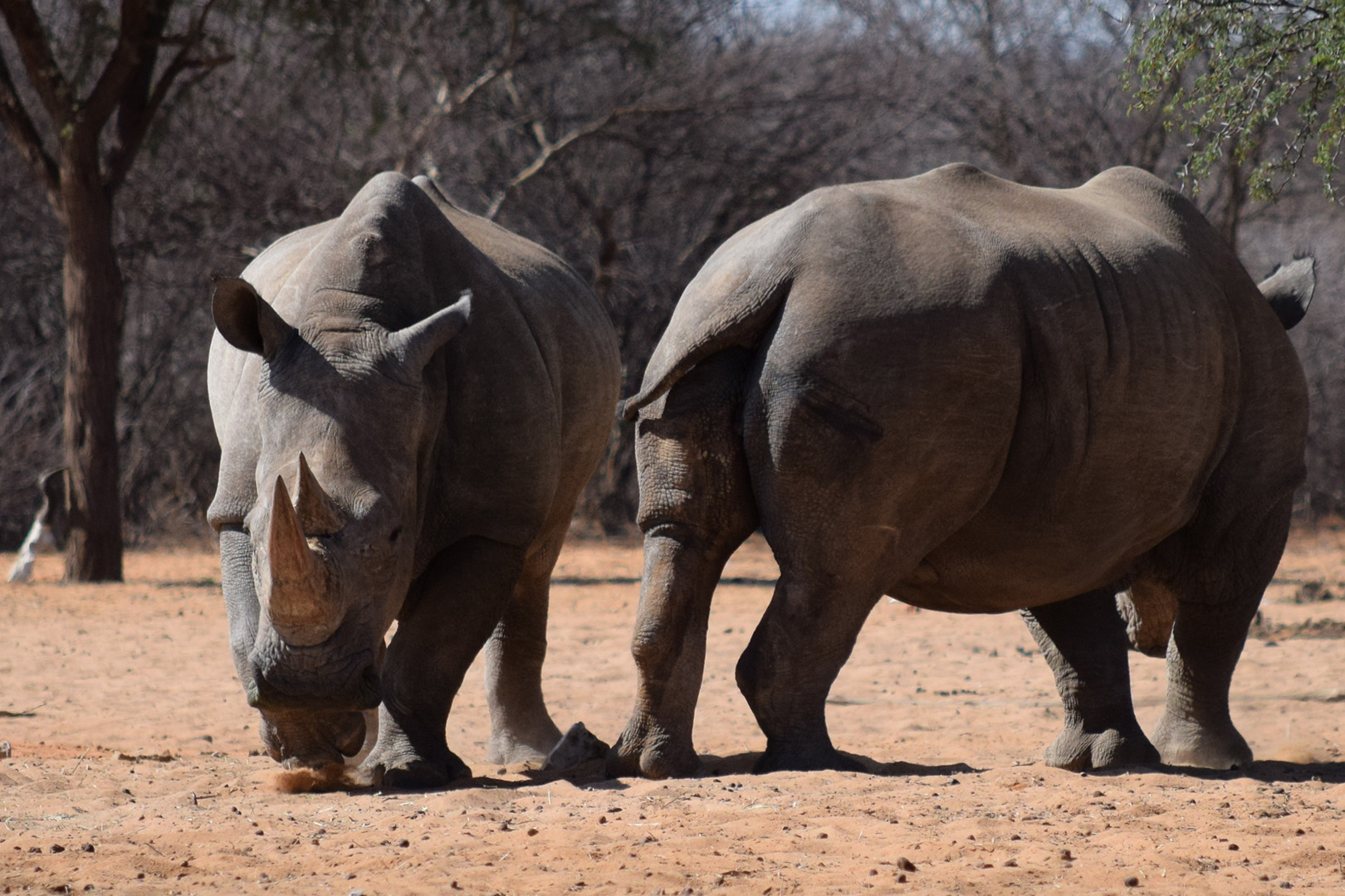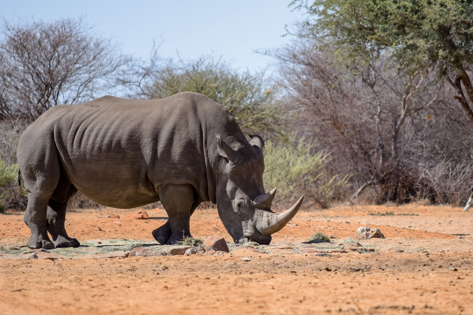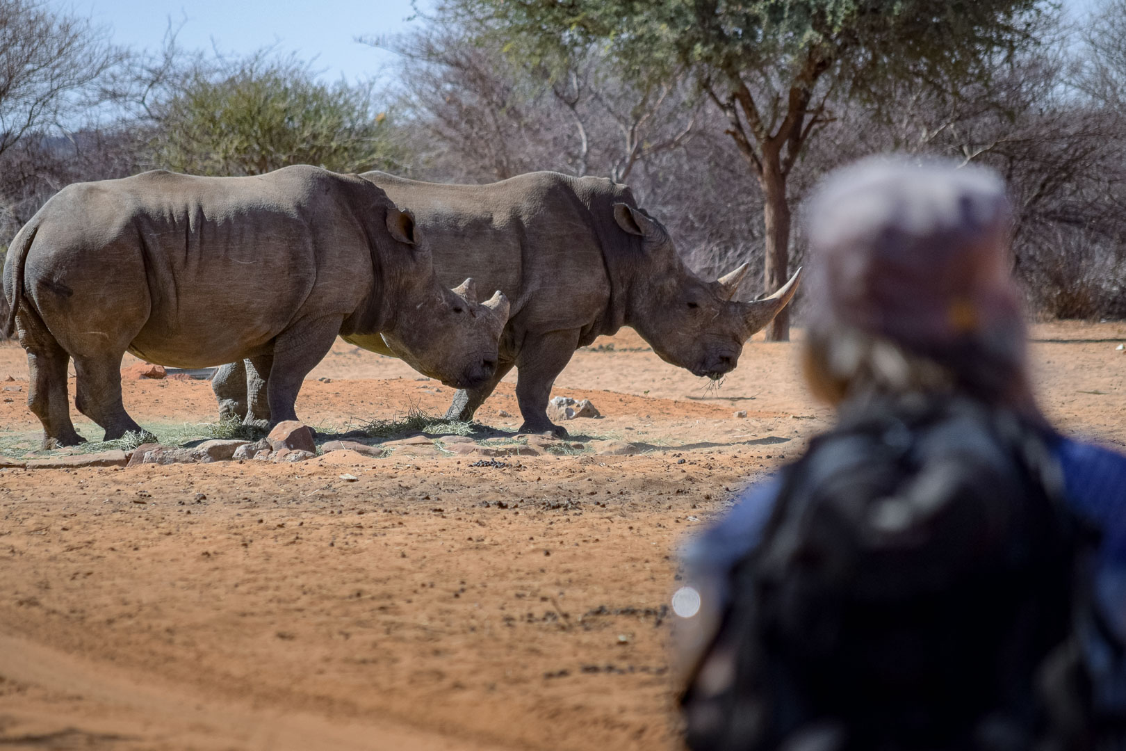 Kein Auto, kein Zaun, kein Wasserloch zwischen uns. Nur die Sträucher und Bäume der namibischen Savanne. Ein Bulle hebt den Kopf, schaut in unsere Richtung. Hat er uns gehört? Hat er uns gerochen? Ich mache mir schon mal Gedanken wie ich einem bis zu 45 km/h schnellen Nashorn hier im Sand davonlaufen will.