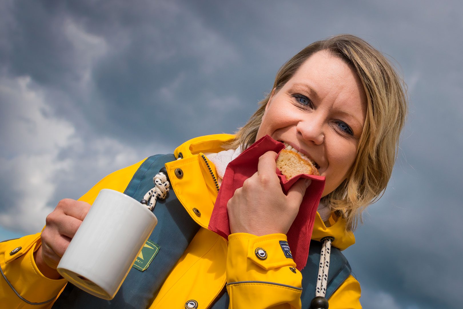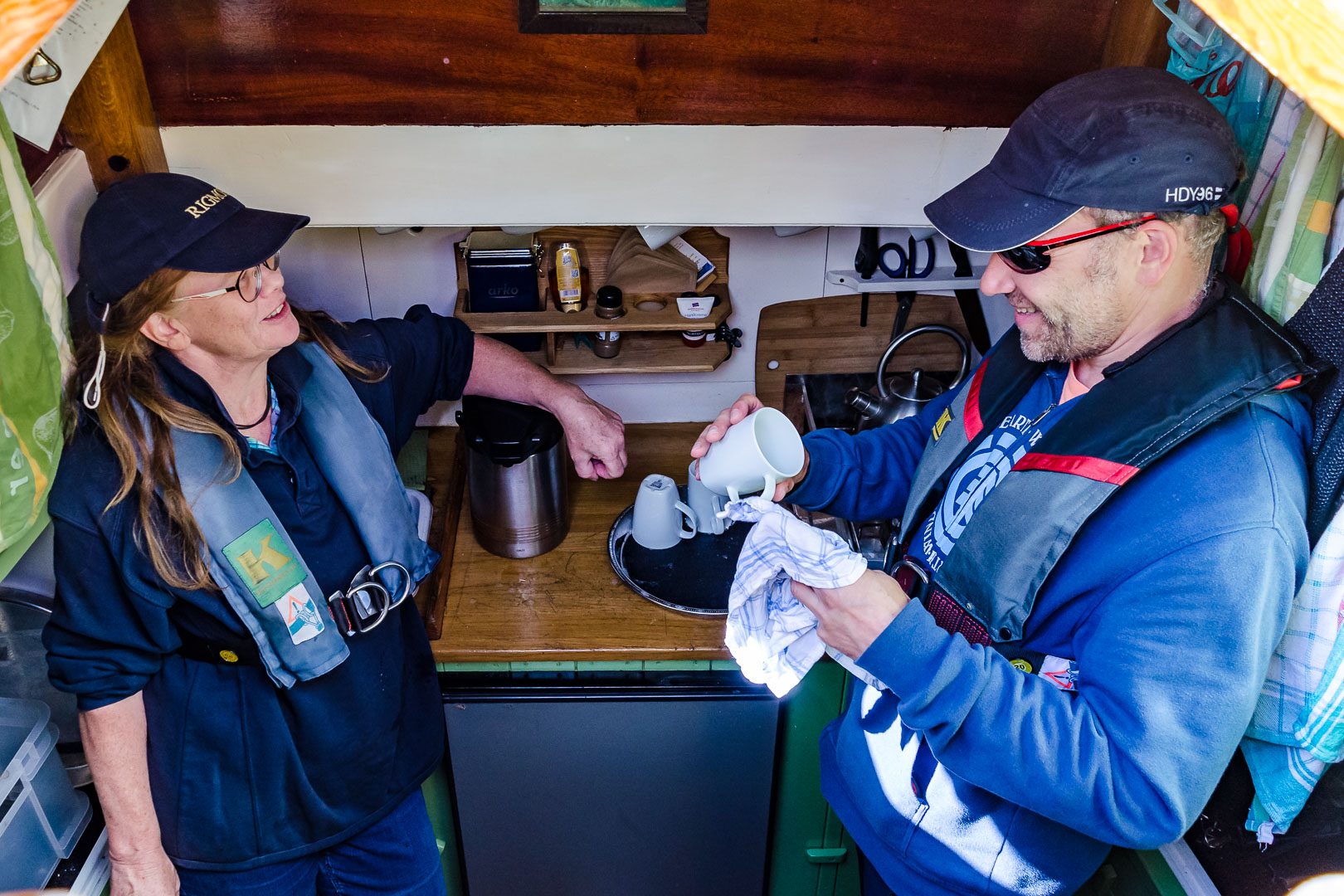 Die Segel werden gehisst, immerhin 129m², die Gäste dürfen selber mit Hand anlegen, Köpfe müssen eingezogen werden, wenn sich der Baum über die Schiffsseite bewegt. Sobald die Arbeit erst einmal getan ist, wird es an Bord etwas ruhiger. Aus der kleinen Schiffskombüse werden Kaffee und Kuchen gereicht. Es ist eng da unten, aber zu zweit lässt es sich auch gut arbeiten. “Übrigens gibt es in der Kombüse auch zwei Kojen, die bei Bedarf und längeren Fahrten auch genutzt werden” erzählt mir Tina, die seit vier Jahren als Ehrenamtliche auf der RIGMOR mitsegelt und hier den Spitznamen “Tina von RIGMOR” trägt.